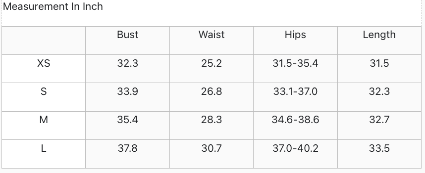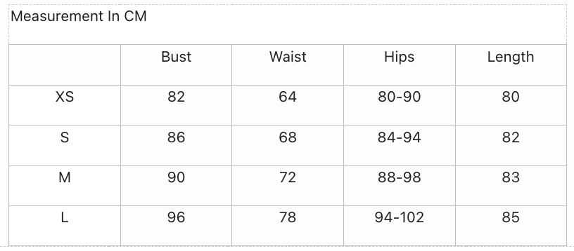 Below the General Size Chart for Dresses