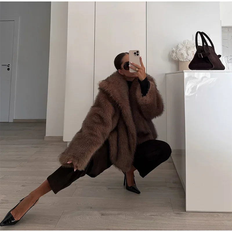 Ostanite topli i elegantni uz našu smeđu kratku žensku jaknu od umjetnog krzna na preklop. Mekani materijal od umjetnog krzna dodaje dašak luksuza svakoj odjeći, dok smeđi dizajn revera dodaje dašak klasike i svestranosti. Savršen za boravak ugodan i šik tijekom hladnijih mjeseci.