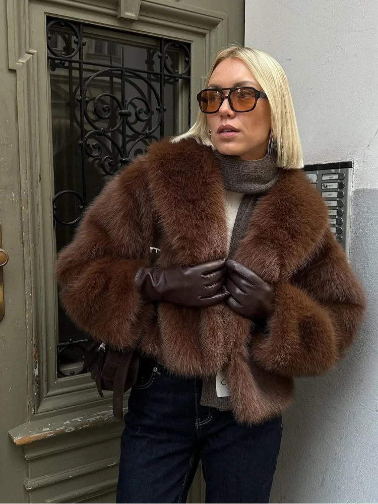 Smeđa ženska kratka jakna od umjetnog krzna na rever