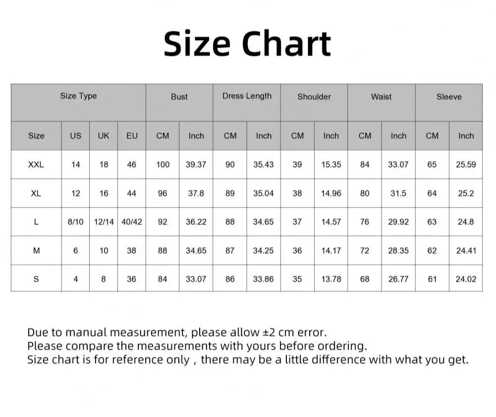 Size: XL, Bust: 96cm/37.8", Dress Length: 89cm/35.04", Shoulder: 38cm/14.96", Waist: 80cm/31.5", Sleeve: 64cm/25.2" (Approx.)
