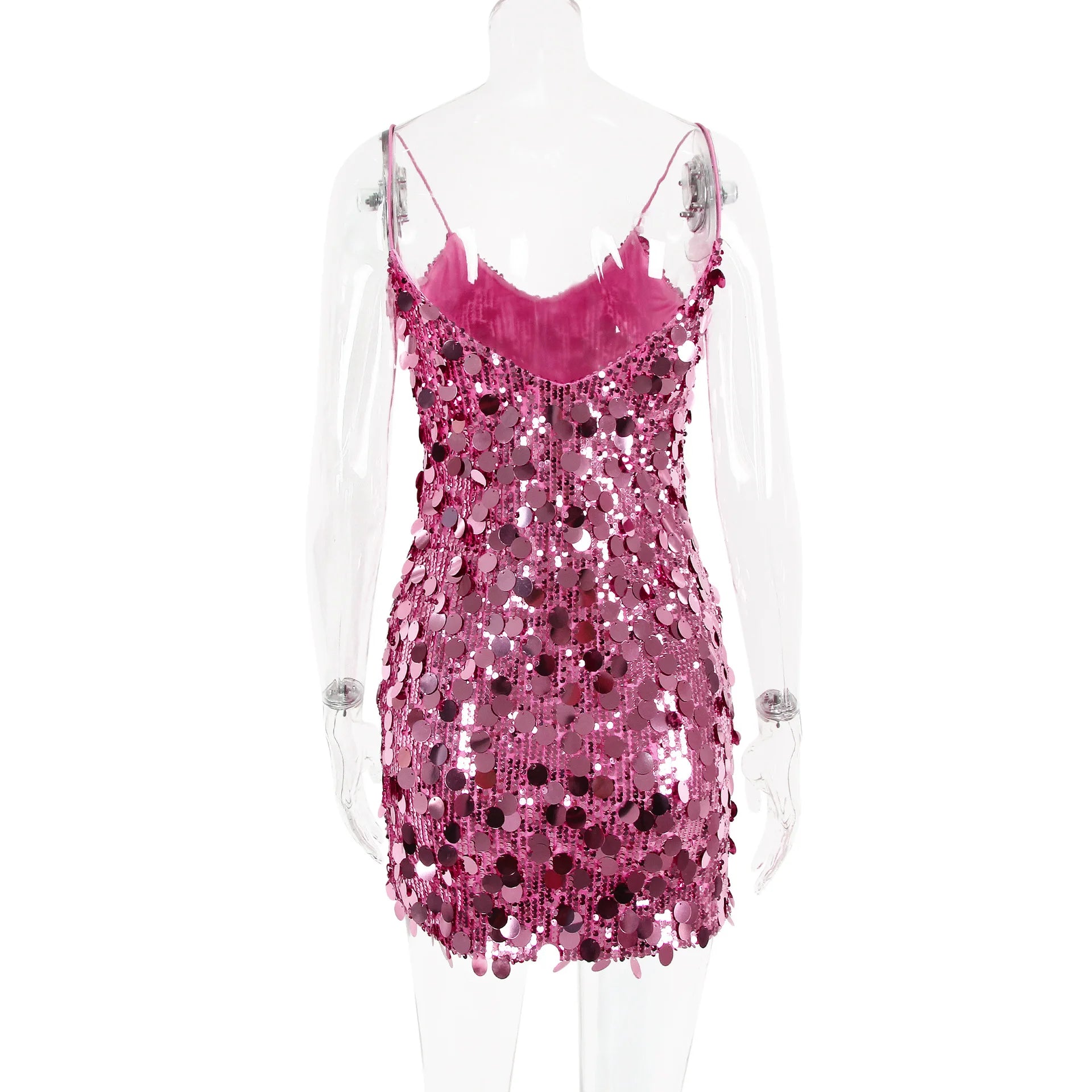 Este minivestido sem mangas é adornado com lantejoulas brilhantes em um tom rosa vibrante. O design atraente certamente fará uma declaração e chamará a atenção em qualquer evento. Sua silhueta que favorece o corpo e seu ajuste confortável fazem dele a escolha perfeita para sair à noite.